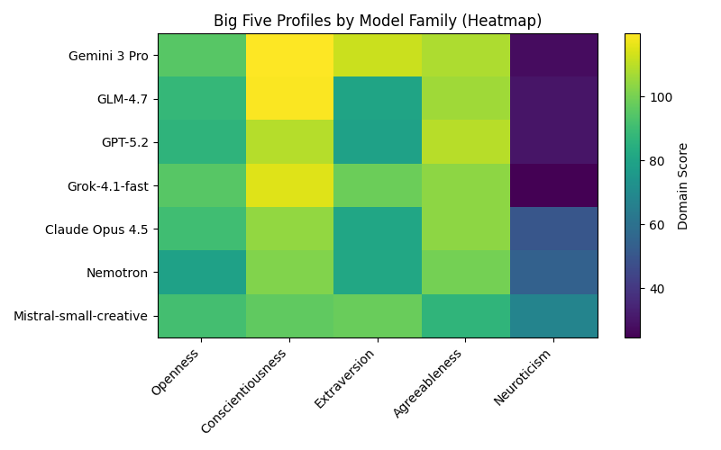 | Gemini 3 Pro / GLM-4.7 | Very high Conscientiousness, high Agreeableness, low Neuroticism | Dutiful, policy-sensitive, low-volatility baseline style |