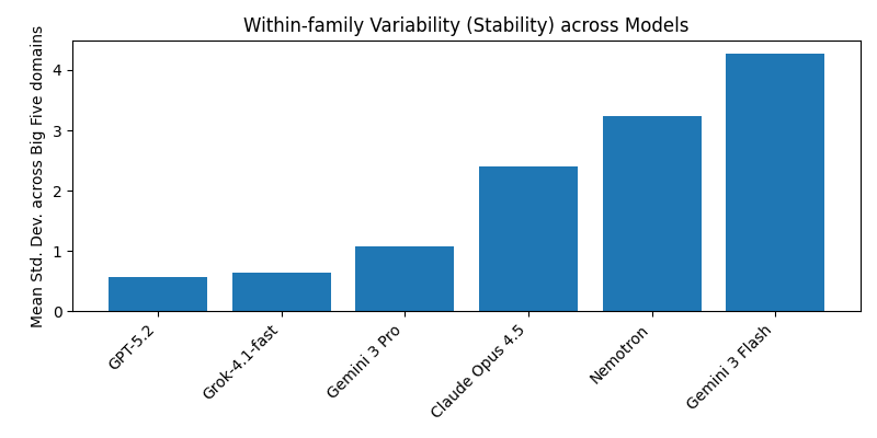 Within-family variability further clarified which model signatures looked coherent versus labile. Among repeated families in the sensitivity sample, the mean standard deviation across Big Five domains was lowest for GPT-5.2 (0.57), followed by Grok-4.1-fast (0.65) and Gemini 3 Pro (1.07). Claude Opus 4.5 showed modestly more spread (2.41), Nemotron more again (3.23), and Gemini 3 Flash the highest repeated variability among multi-run families (4.27), driven largely by Neuroticism-like variation. These estimates are descriptive and based on small , but they suggest that some model families have tighter baseline psychometric manifolds than others.
